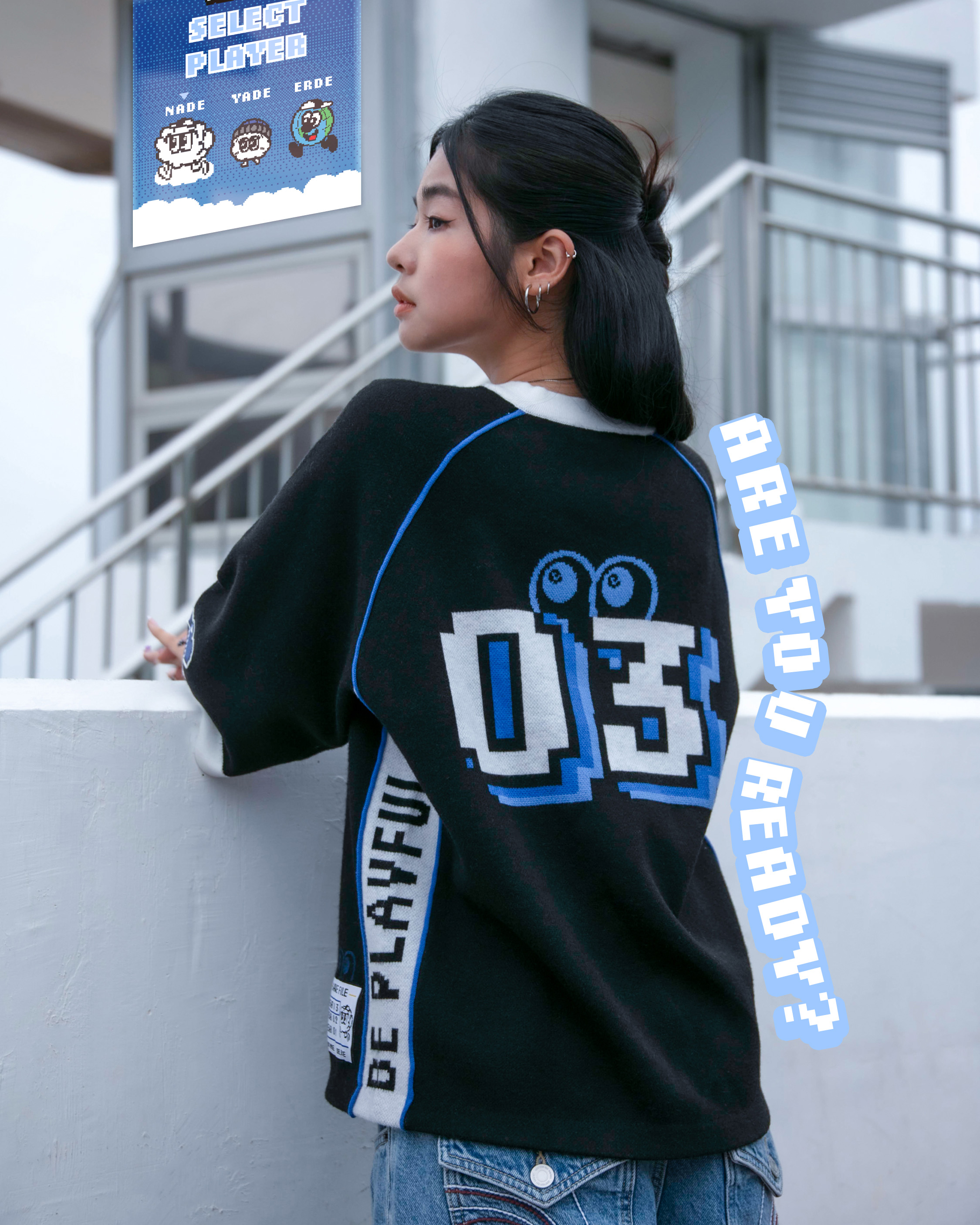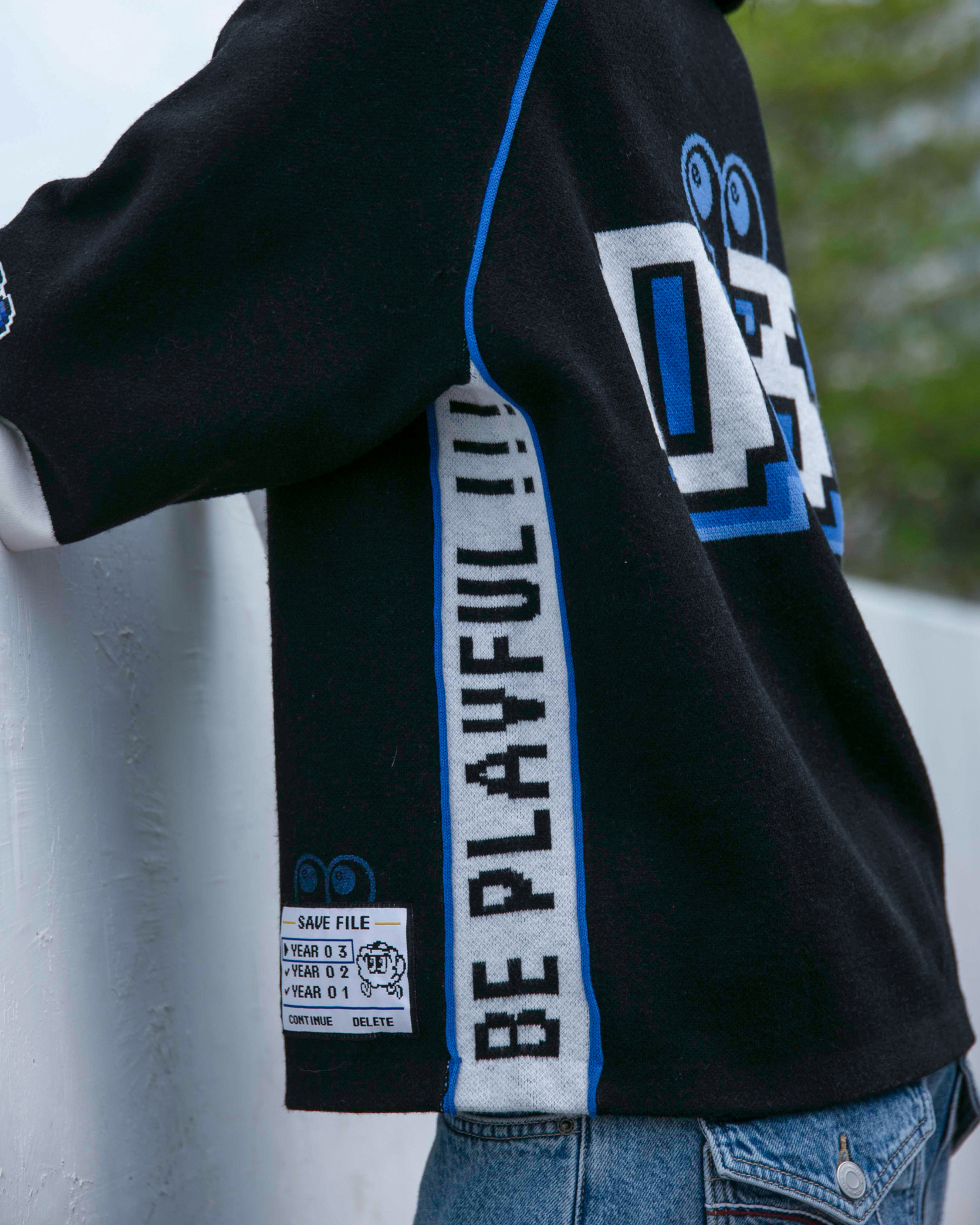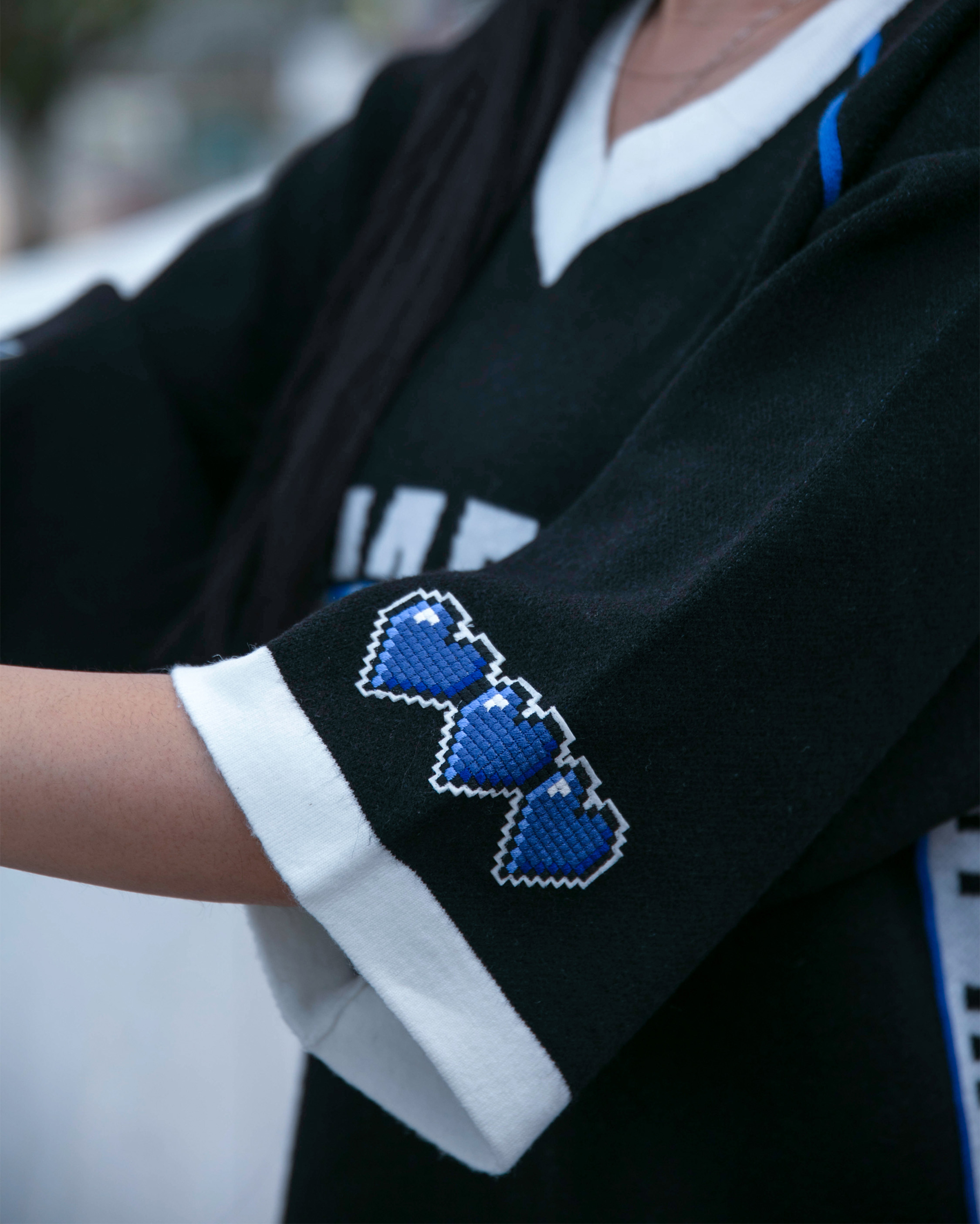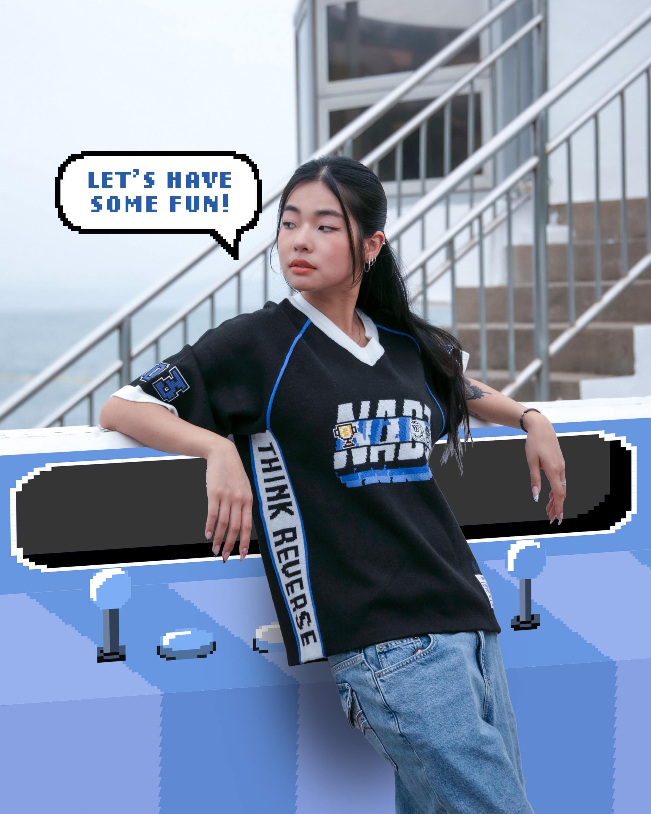 INTRODUCING THE NADE WORLD JERSEY KNIT TEE — A STATEMENT PIECE FOR THOSE WHO LOVE TO STAND OUT AND ENJOY A GOOD GAME! FEATURING VIBRANT PIXEL NAD3 GRAPHICS ON THE FRONT AND A STRIKING "03" ON THE BACK, THIS PIECE CELEBRATES NADE’S THIRD BIRTHDAY WITH THE NADE FAM. SLEEK BLACK FABRIC IS PUNCHED UP WITH NADE BLUE AND WHITE HIGHLIGHTS, WHILE LIVELY SIDE PANELS, CHARMING PIPING, AND PIXELATED SLEEVE BADGES ADD PLAYFUL ATHLETIC TOUCHES.